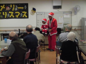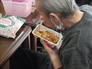 今年のクリスマス会では昼食に生寿司と天丼どちらかを選んで頂き提供しました。